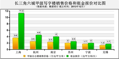 戴德梁行數(shù)據(jù)顯示,截止到2013年年底的一組數(shù)據(jù):上海甲級寫字樓銷售均價3.6萬/平方米,南京為2.3萬/平方米,相差幅度達(dá)36.1%;上海甲級辦公樓租金報價11.3元/平方米/天,是南京(數(shù)值為:4.0元/平方米/天)的2.8倍。[詳細(xì)]