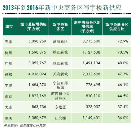 來自世邦魏理仕的一組數(shù)據(jù),2013年-2016年,南京寫字樓市場新增供應(yīng)預(yù)計將達(dá)到182.2萬平方米,其中新中央商務(wù)區(qū)河西CBD的供應(yīng)量就將達(dá)到81.0萬平方米,占比44.5%。 “這是城鎮(zhèn)化背景下,必然的、且不可逆的趨勢。” 世邦魏理仕上海研究部董事謝晨表示,他告訴記者,“中國的主要城市,尤其是長三角一帶,幾乎都在開發(fā)或正在規(guī)劃建設(shè)新中央商務(wù)區(qū),這也成為推動新開發(fā)區(qū)土地價格上漲的關(guān)鍵因素。”