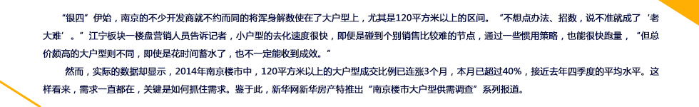 新華網記者通過跟蹤近期南京大戶型市場的供銷情況,發現是“幾家歡喜幾家愁”。調查顯示,誠如城中、河西、甚至仙林,這些單價動輒每平方米兩、三萬元的片區,讓購房者買一套單身公寓都頗感吃力,更別提120平方米以上的大戶型了。