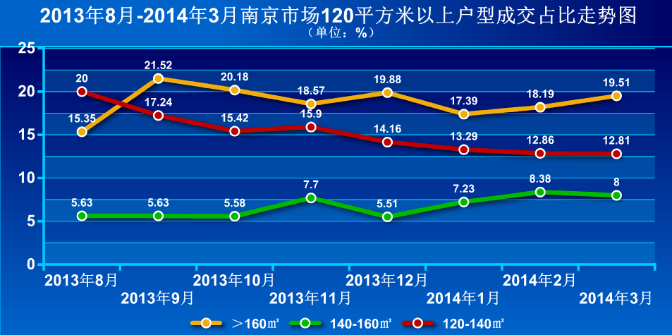 根據世聯行獨家提供的數據,今年一季度三個月,南京樓市中戶型建筑面積在120平方米以上的新增商品房成交比例分別達到了37.91%、39.43%及40.32%。 經新華房產記者計算,三個月月均以1.2個百分點增長,平均銷售占比達39.22%,即“10個購房者中就有4個選擇了大戶型”。[詳細]
