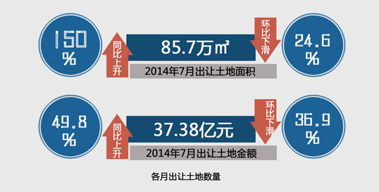 2014年7月份,武漢市土拍出讓16宗土地,出讓土地面積85.7萬㎡,環(huán)比下滑24.6%,同比上升150%;成交金額為37.38億元,環(huán)比下滑36.9%,同比上升49.8%。