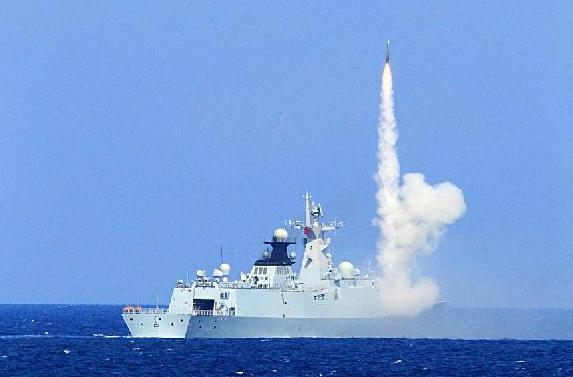 A missile is fired during a Chinese navy drill in South China Sea, July 28, 2015. The ongoing drill is part of the annual exercises, Chinese navy spokespersonLiang Yang said on Saturday, playing down "excessive interpretations." Liang said that such a drill is in line with international laws and practices, and the navy will continue to hold similar drills in the future. [Photo/CFP]