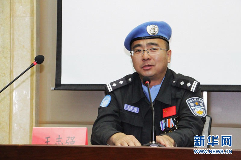 ????授課期間,維和英雄楊占江為學員們做了以《中國力量 藍盔風采》為題目的演講,講述了第二支赴利比里亞維和警察防暴隊遠赴西非、攻堅克難、歷盡艱辛的維和經歷,分享了他們遠離祖國、恪盡職守、感人至深的心路歷程,集中展現了防暴隊在復雜動蕩的局勢、艱苦惡劣的環境、埃博拉疫情肆虐的形勢下取得的卓越成就,充分展示了維和防暴隊文明之師、威武之師、和平之師的良好形象。授課結束后,維和英雄與學員們進行了座談交流,防暴隊副隊長王志強和隊員楊占江一一解答了學員們提出的問題,并與現場學員合影留念。(格日勒朝克圖 張志敏)