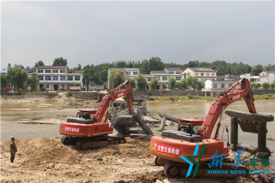 在湖北紅安七里坪鎮,武警交通二總隊官兵拆除損毀的橋梁。