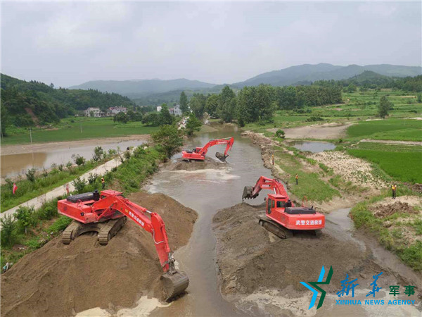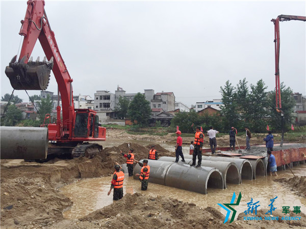 在湖北麻城,官兵修復(fù)搶通涵管橋。