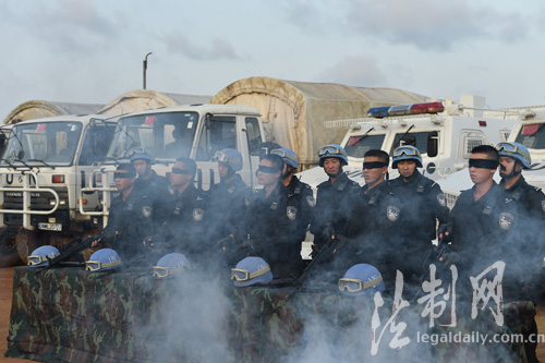 圖為11月19日,中國(guó)第四支駐利比里亞維和警察防暴隊(duì)隊(duì)員進(jìn)行蒙眼分解槍支訓(xùn)練 李金良攝