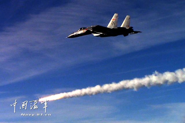 ↑資料照片:殲-15艦載戰(zhàn)斗機(jī)發(fā)射導(dǎo)彈。