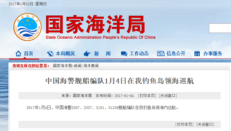 據國家海洋局網站報道,2017年1月22日,中國海警2501、2308、2302艦船編隊在我釣魚島領海內巡航。