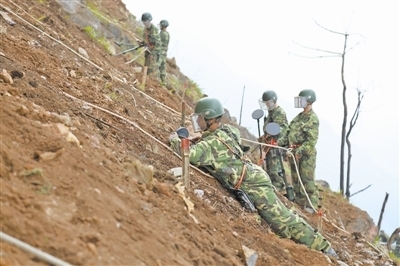 30余名官兵身著數十斤重的迷彩防護服,腰系白色安全繩,右手持探雷器,左手抓繩,像城市高樓間的“蜘蛛人”一般,在近乎垂直的山坡上進行人工搜排作業。隨著金屬探雷器報警聲不斷,官兵們反復掃描確認,再抽出探雷針,向土里輕輕捅扎,確認地雷位置、大小、類型,插上小紅旗標識……