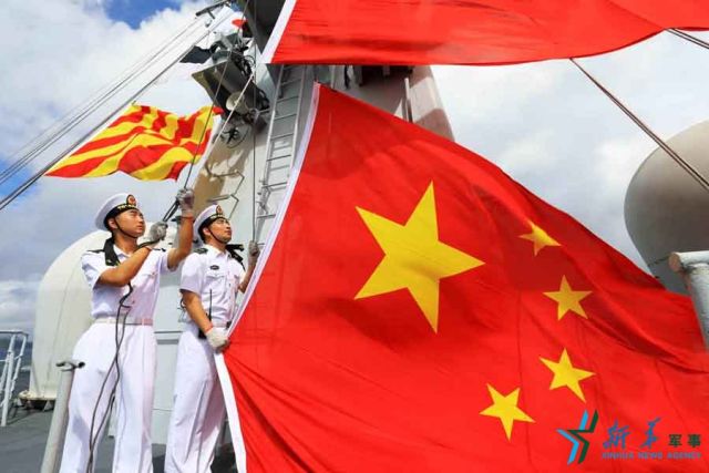 ↑遼寧艦在維多利亞灣泊后,信號(hào)兵將國(guó)旗升起。張凱 攝(據(jù)新華社客戶端)