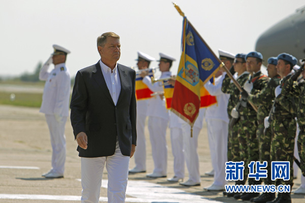 7月13日,羅馬尼亞總統約翰尼斯視察米哈伊爾-科格爾尼恰努空軍基地。新華社發(克里斯泰爾 攝)