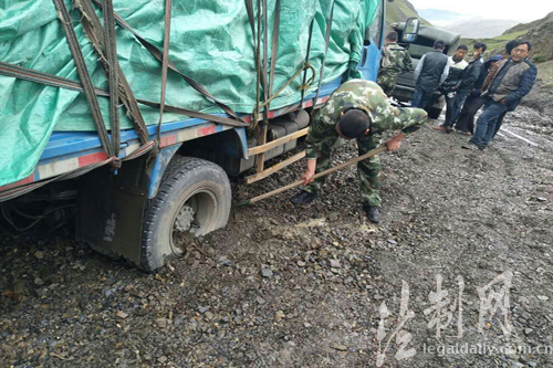 ????連日來,受強降雨天氣影響,通往西藏山南市錯那縣卡達鄉道路因山體塌方和泥石流損毀嚴重,7月23日中午12時,西藏邊防總隊山南邊防支隊卡達邊防派出所接轄區居民電話報警稱:商店運貨貨車在返回卡達鄉途中陷入泥潭,請求派出所救援。接到消息后,該所迅速組織官兵趕往現場,并持續關注道路情況和受困狀況。到達現場后,邊防官兵立即展開救援,用十字鎬挖、用手刨、用人推,經過2個小時的不懈努力,最終成功把陷入泥坑的貨車拉出。救援結束后,邊防官兵就近取材把泥坑填平,并設立警示標志,確保后續車輛順利通過。現場無人員受傷,車輛完好。