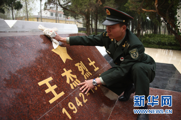 “王杰班”第29任班長劉佳玉擦拭王杰烈士紀念碑(2014年4月3日攝)。新華社發(趙聰 攝)