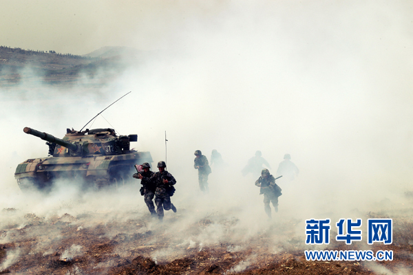 在一次實兵演習中,“王杰班”所在連隊官兵配合坦克突入“敵”一線陣地(2014年10月16日攝)。新華社發(王磊 攝)
