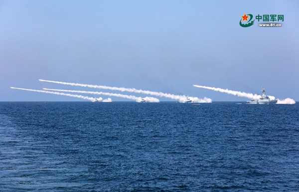 8月7日,海軍在黃海、渤海相關(guān)??沼蚪M織實(shí)兵實(shí)彈對抗演習(xí),最大限度檢驗體系作戰(zhàn)能力、戰(zhàn)法訓(xùn)法、武器裝備效能,共實(shí)射各型導(dǎo)彈數(shù)十枚。這是水面艦艇齊射反艦導(dǎo)彈。李唐 攝(圖片來源:中國軍網(wǎng))