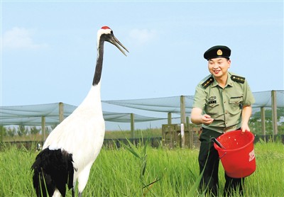 ????駐守在這里的邊防官兵主動承擔起守護濕地生態、保護野生動物的使命,他們日夜穿梭巡邏在廣袤的濕地。僅今年以來,該所依托“警民義務護鳥隊”、“護鳥熱線”等平臺,組織官兵巡邏踏查保護區核心區域120余次,定期向丹頂鶴等各類候鳥投放玉米等飼料。同時,該所深入轄區向村民宣傳《野生動物保護法》,讓這片土地真正成為候鳥的一片樂土,獲得了保護區、駐地政府以及當地百姓的贊譽,邊防官兵們被親切地稱作候鳥“守護神”。圖為官兵喂食丹頂鶴。(童瑞金 耿建平)