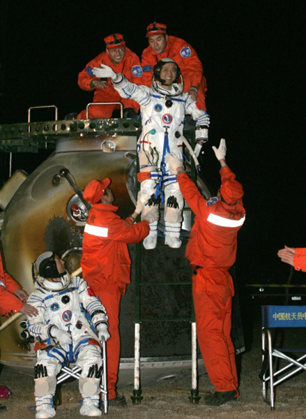 ????2008年9月28日,神舟七號返回地球,航天員翟志剛、劉伯明、景海鵬(從左至右)自主出艙后向現場搜救人員揮手致意。新華社記者 王建民 攝