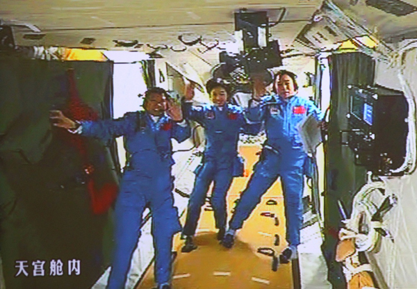 ????2012年6月18日,北京航天飛控中心大屏幕顯示航天員景海鵬、劉洋、劉旺(從右至左)在天宮一號實驗艙內。新華社記者 查春明 攝