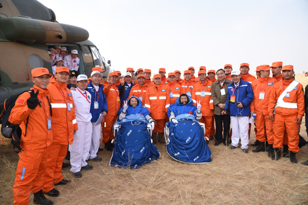 ????2016年11月18日,航天員景海鵬(左)、陳冬在四子王旗著陸場順利返回。新華社發(孔方舟 攝)