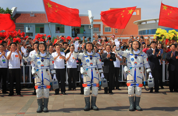 ????2012年6月16日,神舟九號航天員出征儀式在酒泉衛星發射中心航天員公寓問天閣舉行,航天員景海鵬、劉旺、劉洋(從右至左)向歡送人群揮手致意。新華社記者 李剛 攝