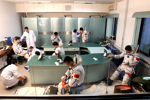 ????2002年6月17日,航天員在進行穿脫訓練。新華社發