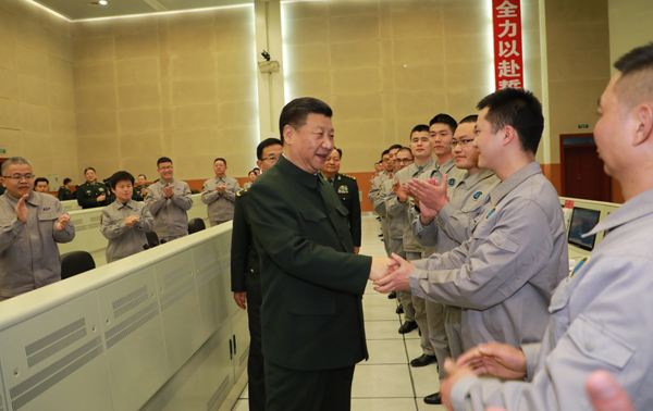 離開指揮大廳,習近平來到一處技術廠房,通過展板詳細了解基地發展歷程情況,對基地為中國航天事業作出的重要貢獻給予充分肯定。習近平親切接見基地所屬有關部隊副團級以上干部,并發表重要講話。習近平強調,要強化使命擔當,堅定航天報國志向,堅定航天強國信念,弘揚“兩彈一星”精神、航天精神,創造更多中國奇跡。要強化打贏本領,大抓實戰化軍事訓練,深化戰法訓法研究探索,提升航天發射和作戰能力,融入全軍聯合作戰體系,為建設世界一流軍隊、建設航天強國提供堅實支撐。要強化改革創新,加快推進轉型發展,堅持向科技創新要戰斗力,加強核心關鍵技術攻關,保持國際競爭主動權。要強化政治保證,加強思想政治建設,抓好各級黨組織建設,做好抓基層打基礎工作,全面從嚴教育管理部隊,確保部隊絕對忠誠、絕對純潔、絕對可靠。