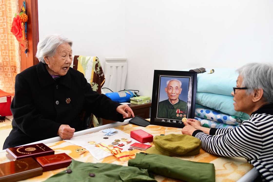 婁淑珍(左)與女兒一起整理周智夫獲得的榮譽章。新華社記者 張永進 攝
