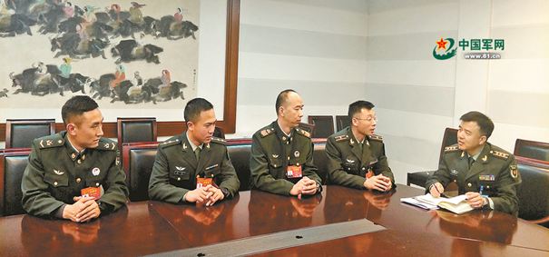 ????解放軍報(bào)記者孫興維(右一)采訪軍隊(duì)人大代表?xiàng)畛醺裎鳌罾凇R虎廣、謝正誼(左一至左四)。尹繼冬 攝
