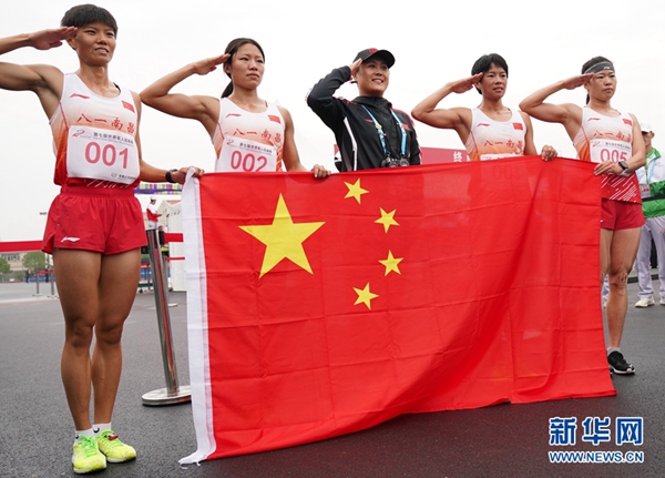 10月23日,中國隊成員在女子個人全能越野跑比賽后手持國旗敬禮。當日,第七屆世界軍人運動會女子個人全能項目比賽在武漢陸軍工程大學軍械士官學校結束,中國選手盧嬪嬪以5627.2分的總成績獲得冠軍,隊友管超楠以5567.6分的總成績獲得亞軍,王堂林以5506.3分的總成績獲得季軍,孫洪燕以5474.1的總成績獲得第四名。新華社記者 王建威 攝