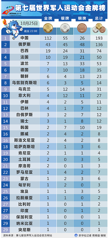 25日比賽結(jié)束后,中國軍團以112金55銀26銅繼續(xù)位居金牌榜和獎牌榜首位,俄羅斯隊以43金45銀48銅位居金牌榜和獎牌榜次席,巴西隊以19金24銀31銅位居金牌榜和獎牌榜第三。