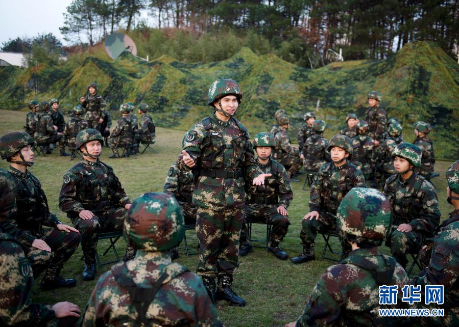 演訓(xùn)間隙,俞細(xì)文在野外訓(xùn)練場(chǎng)組織理論宣講(12月11日攝)。新華社發(fā)(劉明松 攝)