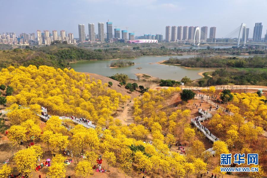 2月21日,游人在南寧市青秀山風景區觀賞盛開的黃花風鈴木(無人機照片)。