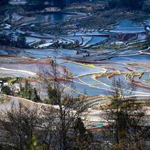 春日里,位于云南省紅河哈尼族彝族自治州元陽縣境內的哈尼梯田在不同光照條件下呈現出豐富色彩,與周邊村寨、山系等和諧相融,猶如一幅幅色彩斑斕的油畫,美不勝收。