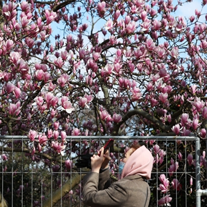 這是3月19日在法國巴黎埃菲爾鐵塔腳下的戰神廣場拍攝的盛放的玉蘭花。新華社記者高靜攝