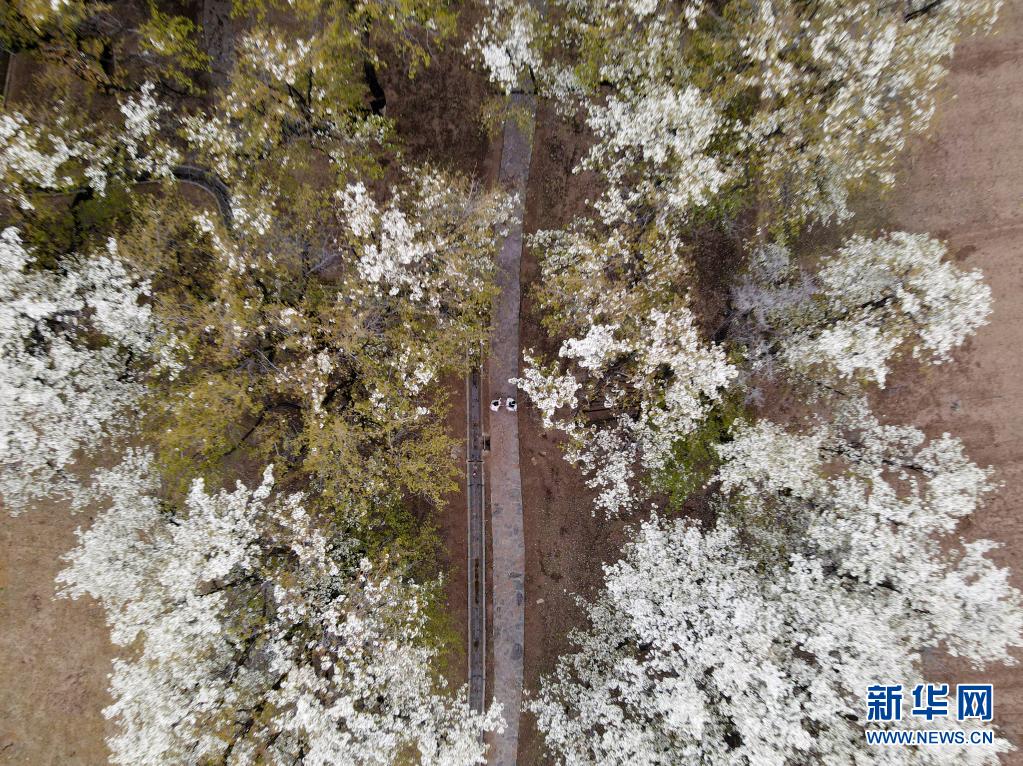 4月3日,游客在中衛市南長灘村觀賞盛開的梨花(無人機照片)。