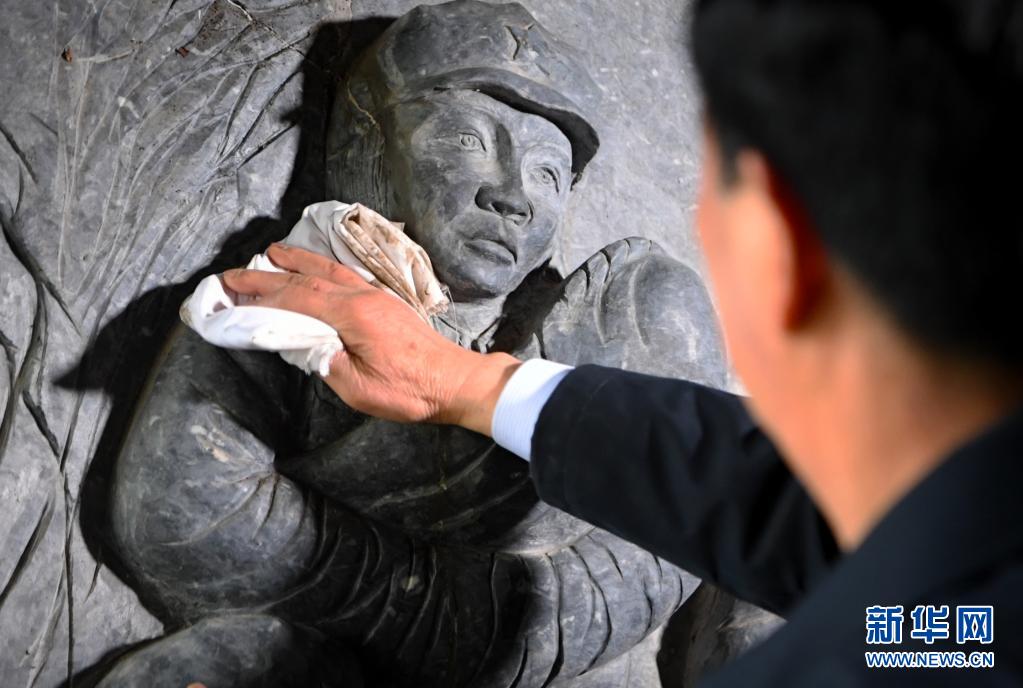 4月2日,曾祥有在金剛臺紅軍洞里擦拭雕塑。