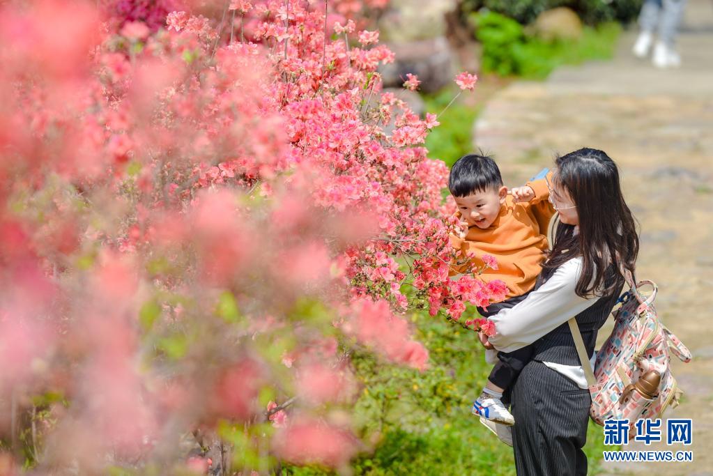 4月5日,一對母子在浙江省湖州市長興縣和平鎮城山溝景區內觀賞杜鵑花。