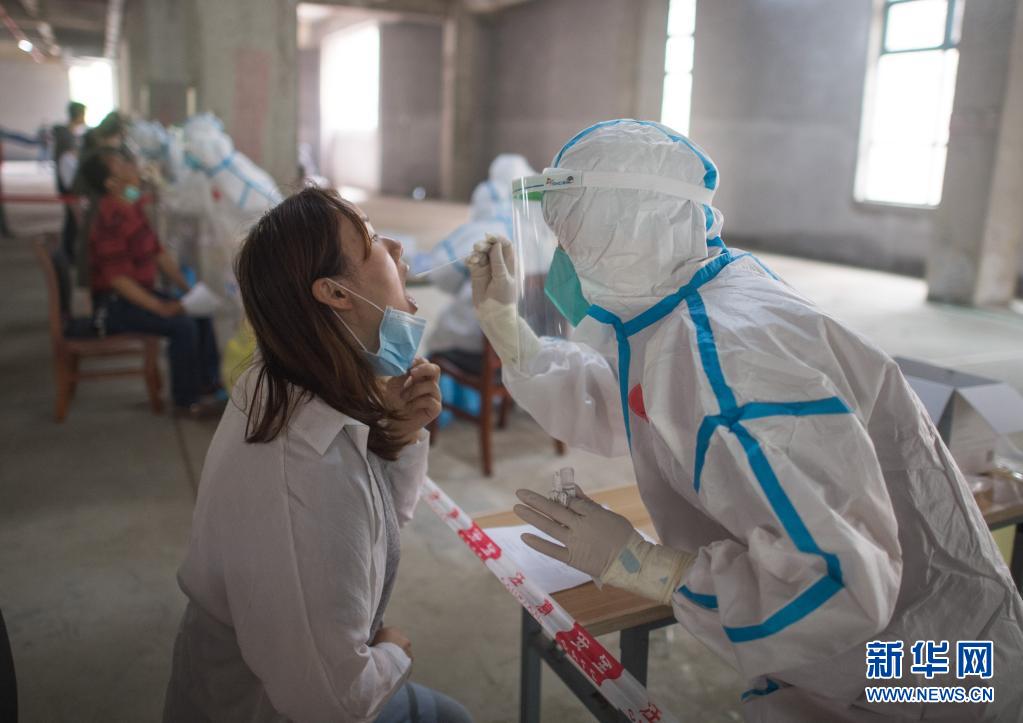 2020年5月15日,在武漢華生漢口城市廣場四期檢測點,工作人員對市民進行核酸檢測。新華社記者 肖藝九 攝