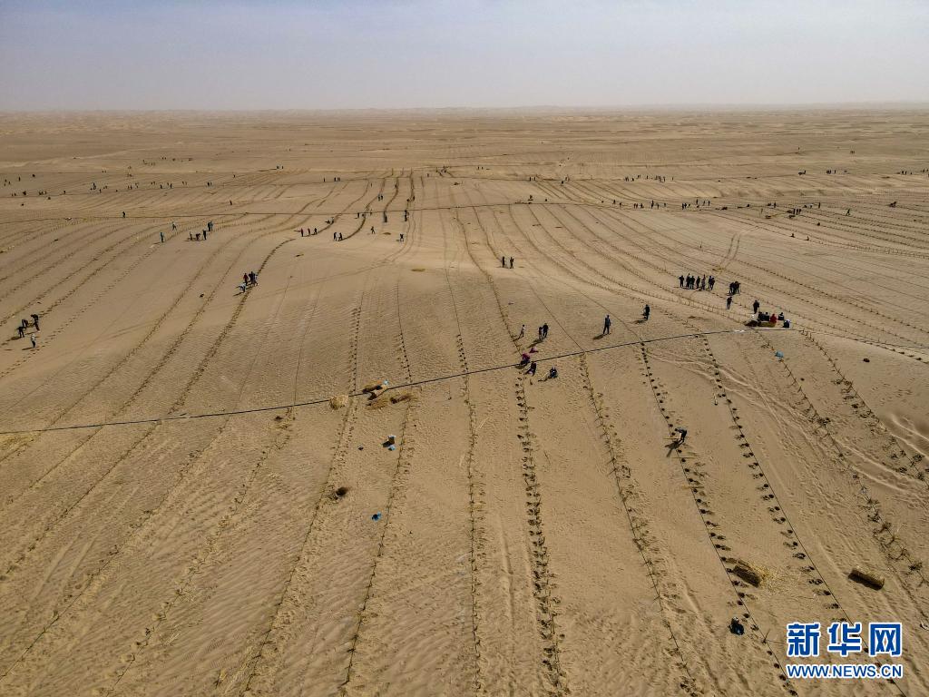 這是在新疆且末縣城不遠處的塔克拉瑪干沙漠內植樹的群眾(3月28日攝,無人機照片)。新華社記者 高晗 攝
