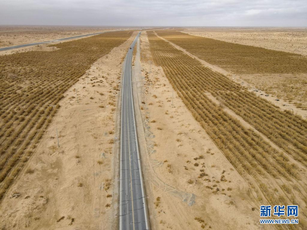 這是且末縣國道旁種植的生態梭梭林 (3月31日攝,無人機照片)。新華社記者 高晗 攝