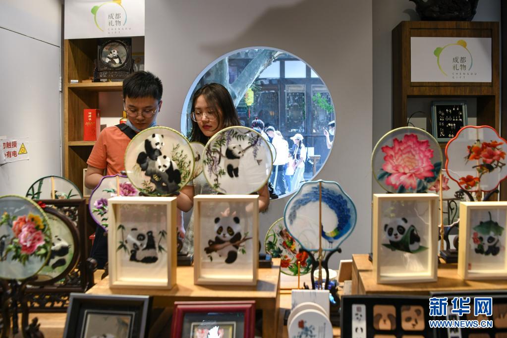 5月1日,游客在四川省成都市寬窄巷子景區的一家商店選購蜀繡產品。