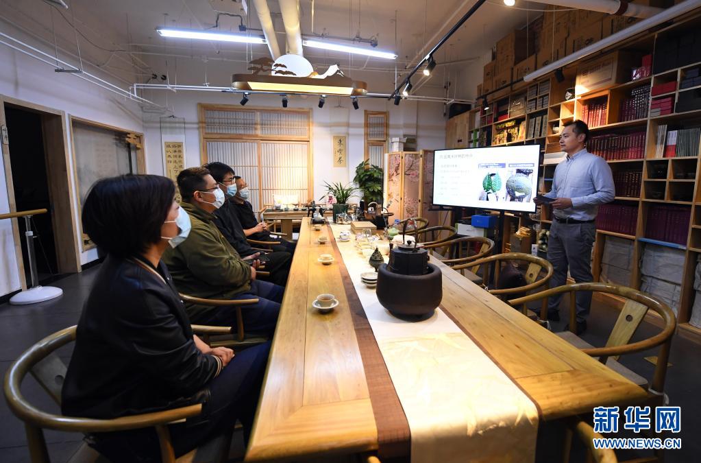 李卓澄(右)在“小茶館”中為客人介紹茶知識(4月29日攝)。新華社記者 任超 攝
