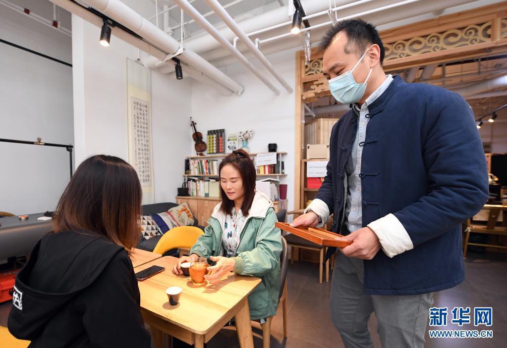 李卓澄(右一)在“小茶館”為客人上茶(4月29日攝)。新華社記者 任超 攝