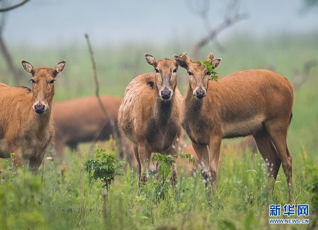 5月17日,一群麋鹿在石首麋鹿國家級(jí)自然保護(hù)區(qū)內(nèi)活動(dòng)。新華社記者 肖藝九 攝