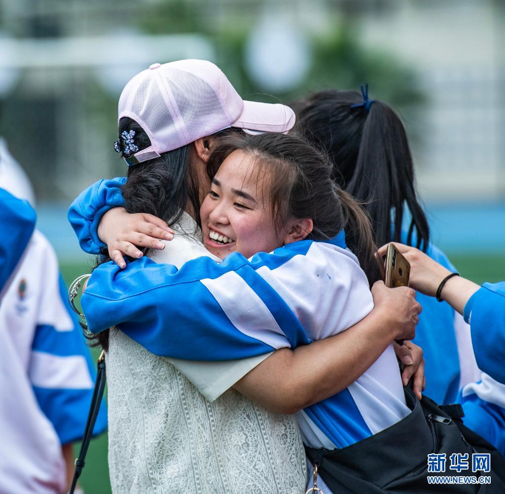 6月9日,烏當中學高三學生和老師擁抱。