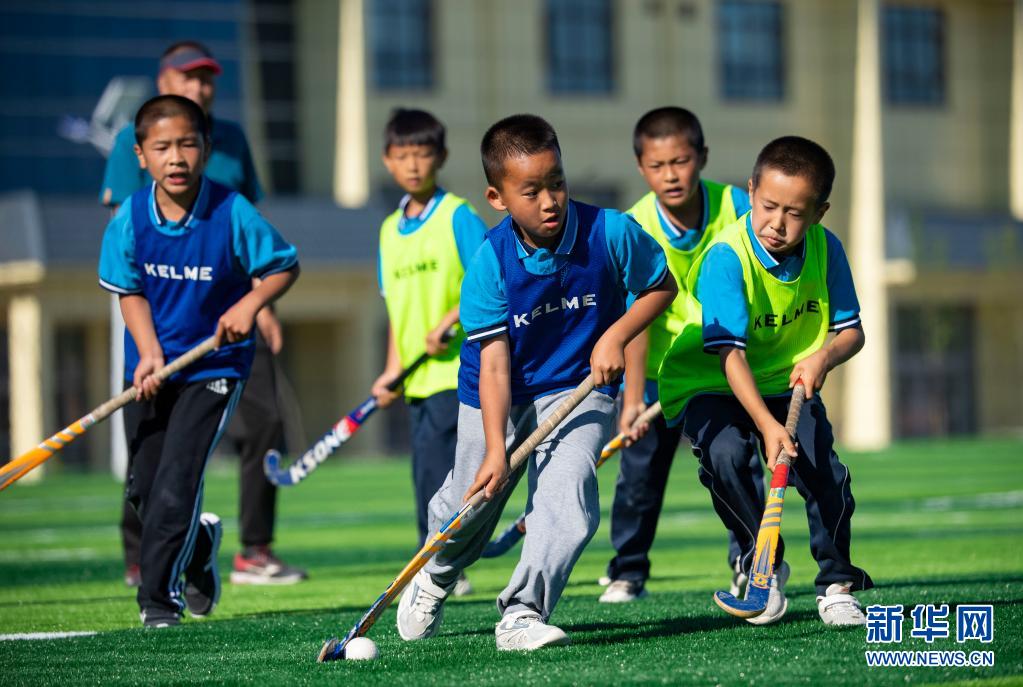 塔城市第二小學曲棍球隊的小隊員們在訓練賽上拼搶(6月13日攝)。