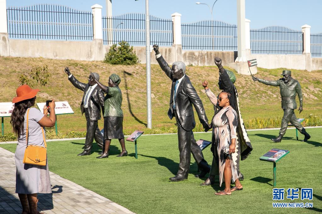 7月18日,在南非開普敦,一名游客和南非前總統(tǒng)納爾遜·曼德拉及其夫人溫妮·馬迪基澤拉-曼德拉的銅像合影。