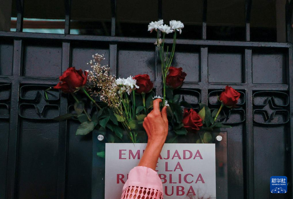 3月4日,在厄瓜多尔首都基多,抗议者在古巴驻厄瓜多尔大使馆门口摆放鲜花。