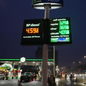 这是3月5日在美国纽约一座加油站拍摄的油价显示屏。