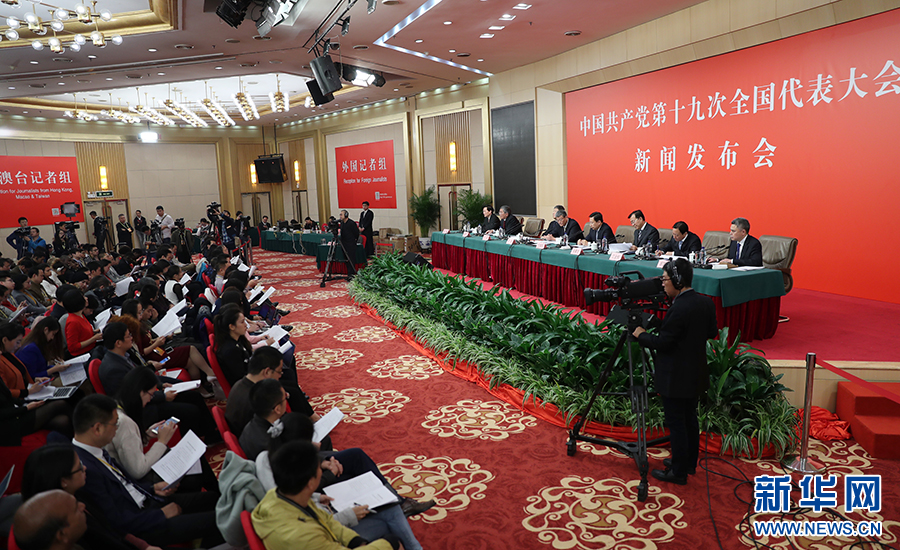 10月26日上午10:00,中國共產黨第十九次全國代表大會新聞發言人在梅地亞賓館二層新聞發布廳召開專題新聞發布會,請有關方面負責人解讀十九大報告,并回答記者關心的問題。圖為新聞發布會現場。新華網 翟子赫 攝